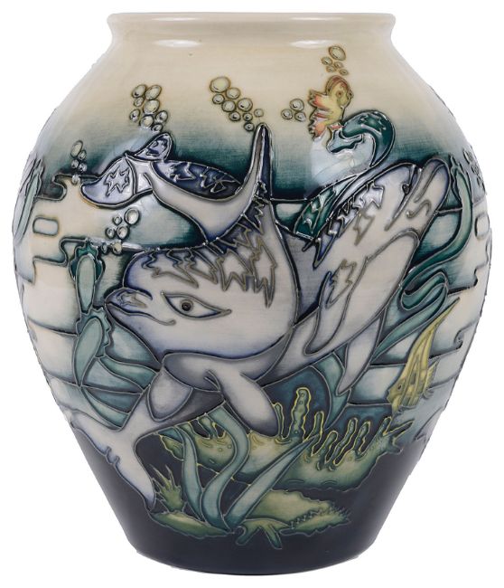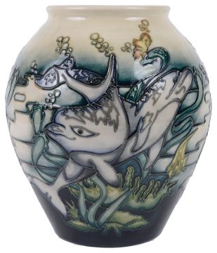 of ovoid form,tube line decorated with dolphins, impressed marks, M.C.C. in brown