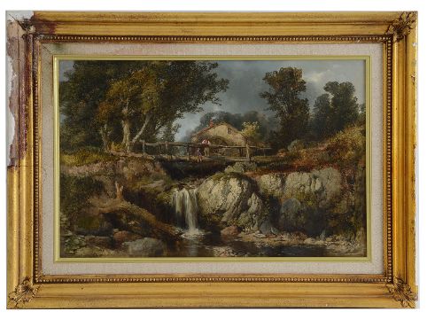 'Watermill with figures on a bridge over a rocky waterfall', oil on canvas, bears monogram verso, poss. V W J, gilt gesso frame
