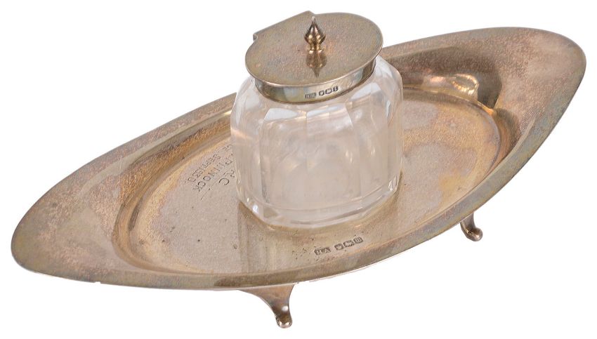 of navette form with raised rim on splayed bracket feet, fitted with a facetted cut glass ink, bears inscription 'Presented by the M C R C To Mr A. G. Manning and Miss M. Pinnock on the occasion of their marriage Sept. 1930.
