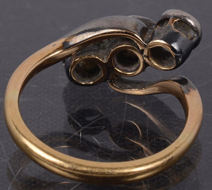 the central collet set diamond approximately 0.30 carats and with smaller stone to either side, mount marked 18ct