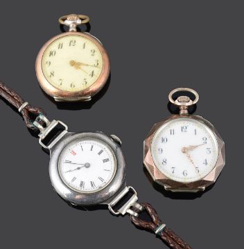 the pocket watches with Swiss and German marks and white enamel dials with Arabic numerals, the wristwatch with white enamel dial and Roman numerals on a plaited leather bracelet, (3)