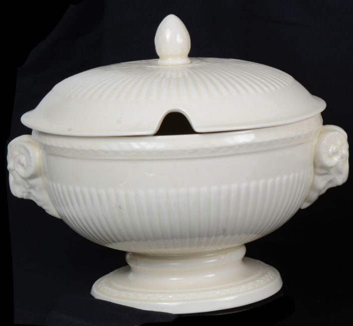 comprising an orange bowl and cover, a twin handled vase and cover and half fluted tureen and tureen with rams mask handles, printed marks, (3)