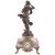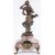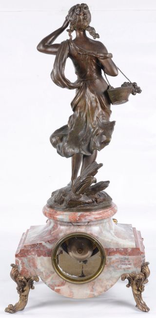 the enamel dial with black arabic numerals and the circular drum 8 day movement striking on a bell, the rouge marble case surmounted with a figure of young woman carrying a basket of fruit after A. Moreau, raise don scroll feet