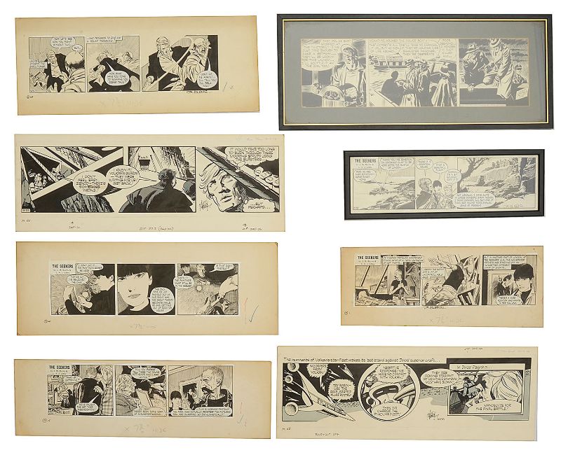 'The Seekers', written by Les Lilley from the Daily Sketch, c.1970, Q 128., framed (6)69., (13)1., (13)15.,(13)41., together with Martin Ashbury (British, b. 1938) 'Garth' from the Daily Mirror, M.55 dated 2-3-78, and M.68 dated 22-3-78, signed, and Alex Raymond 'Flash Gordon', 11-23, signed, framed, original cartoons, pen and ink, (8)
