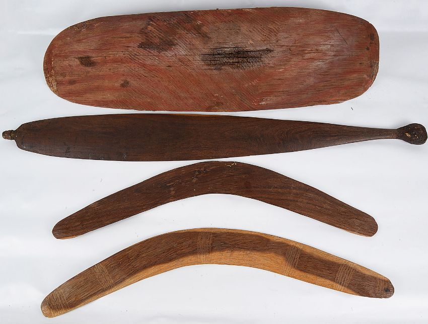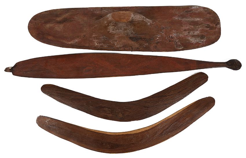 comprising two boomerangs, a broad woomera spear thrower with wooden peg and gut binding and a shield, all with incised decoration, (4)