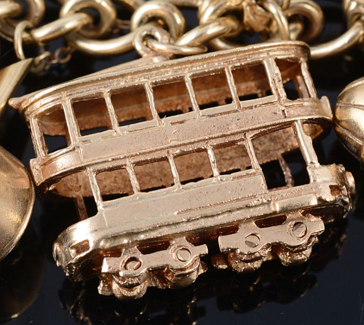 fitted with a heart shaped padlock fastening suspended with various charms, some articulated, including a Victorian half sovereign in removable pendant mount, a large tram, a stein, bagpipes, a bi-plane, filigree teapot and heart box, clothes peg, saucepan, treasure chest, Toby jug and more