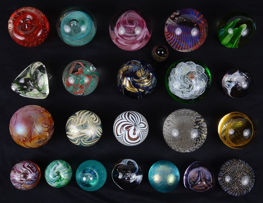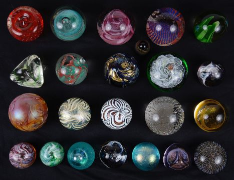 comprising Caithness: 'Razzmatazz', 'Tartan Twist', 'Pastel', 'Pebble' x2 , and 'Mooncrystal' x2; an Okra iridescent paperweight, two by Sarn Glass, two by Guernsey Island Studio and ten others, (23)