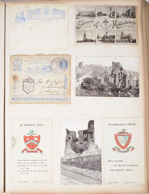 to include a 1890 Uniform Penny Post Jubilee Mulready envelope, together with an Edwardian album of postcards, (2)