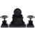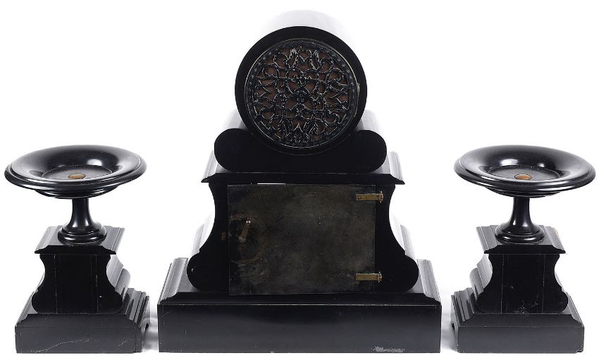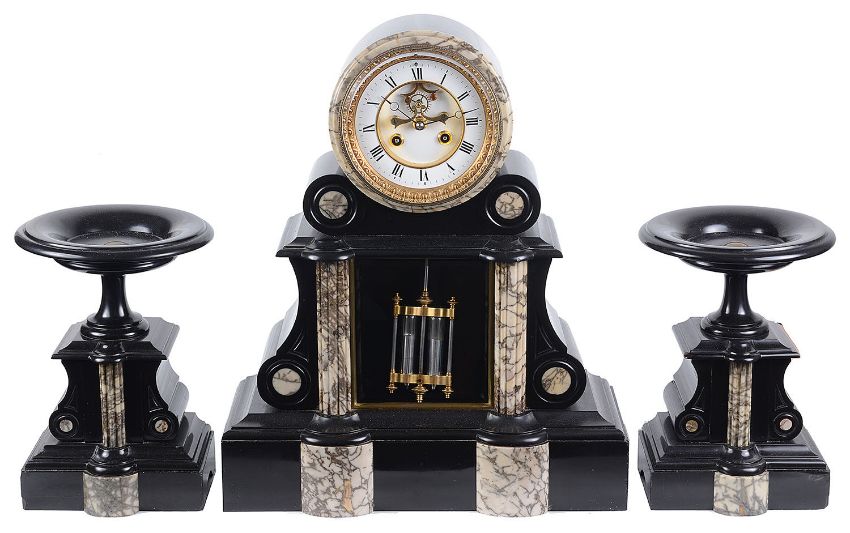 A late 19th century architectural drum black slate and marble three piece clock garniture