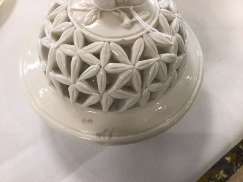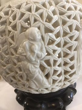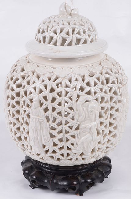 A 19th century Chinese blanc de chine reticulated lobed ginger jar and cove on hardwood stand