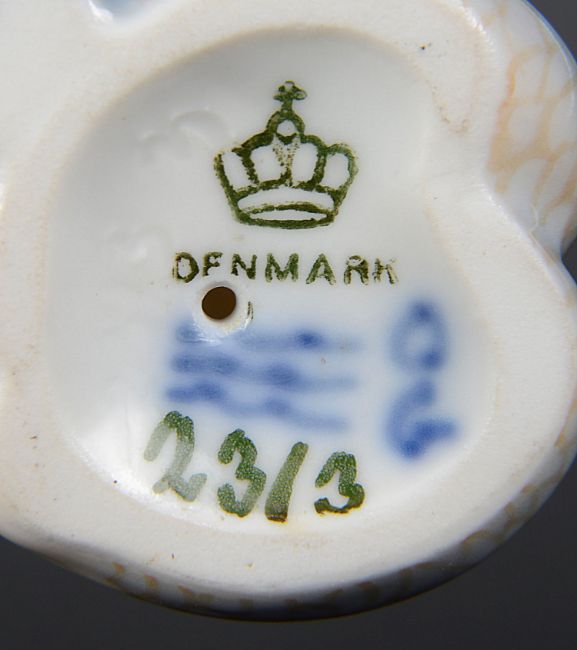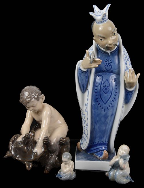 648 - Faun wrestling with a bear, 4382 - The Emperor and the Nightingale designed by Johannes Hedegaard, 2348 - Mermaid with fish, and 2313 - Seated mermaid, factory marks (4)