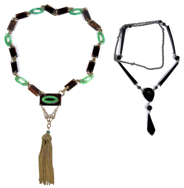 the necklace formed of faux jade and onyx links and panels and having large gilt fancy tassel pendant, together with another 1920s flappers necklace (2)
