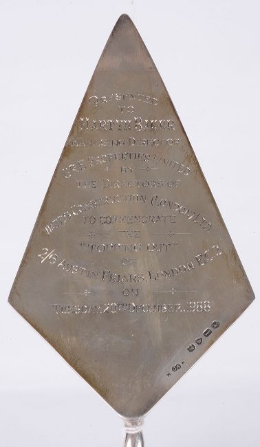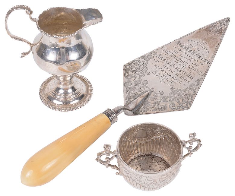 of plain ogee baluster form, on a spreading pedestal foot, gadrooned rim and foot rim, A Victorian ivory handled presentation silver trowel, London 1886 by Chawner & Co, engraved 'presented to Mr Councillor W Jenkinson on the occasion of his laying stone of the foundation stone of the Mehodist New Connexion Day & Sunday School - Strangeways - May 21st 1870, the reverse with a later presentation inscription, and a small twin handled cup, London, 1896 by Goldsmiths & Silversmiths Co., (3)