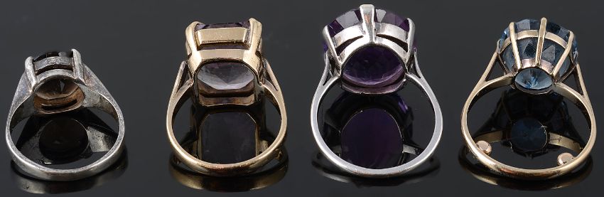 A large single stone blue zircon set ring and three other rings