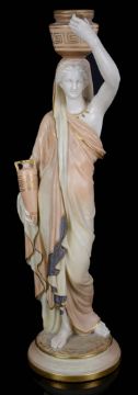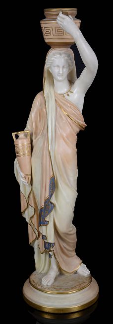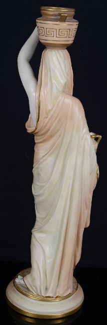 A large Royal Worcester blush ivory figure of a water carrier, circa 1906, modelled as woman wearing Arab clothing, an amphora in her right hand and an urn on her head, raised on a circular gilt edged base, puce printed marks to base, model number 125