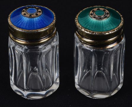 A pair of Norwegian silver-gilt and enamel topped glass salt and pepper pots by David Andersen