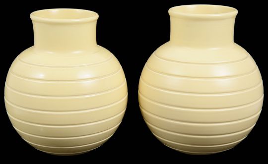 shape no. 4197, cream glazed each of globular form with grooved bands, printed marks, (2).