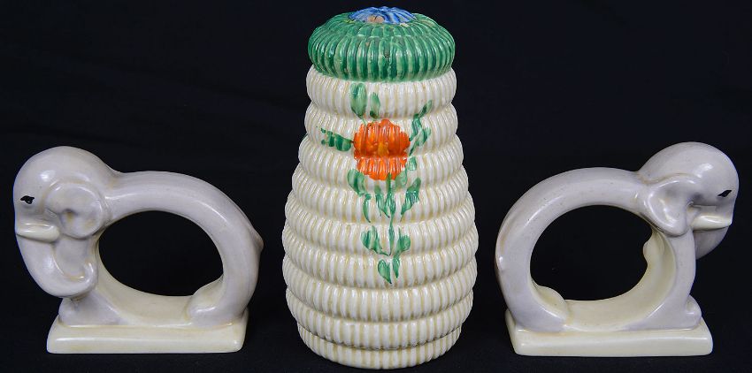 A rare pair of Art Deco Clarice Cliff napkin rings, each modelled in the from of a grey elephant on a cream glazed rectangular base, black printed factory marks to bases, together with an Art Deco pottery ribbed and lobed floral painted sifter painted with flowers (3)