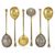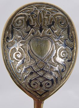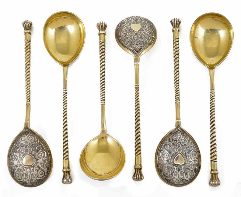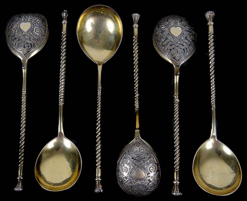 with spiral twist stem and leaf knop finial, reverse of bowl with niello scrollwork centred with a vacant heart shaped reserve, (6)