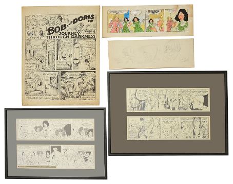 comprising Stanley White (1904-1988) 'No 1 Bob and Doris in Journey through Darkness', signed in pen with dedication to Les Lilley, dated verso 1946 together with Les Bartion and Les Lilley, 'The Dolly Birds', Anthony Hutchings and Les Lilley 'Allsorts' published in The European, framed; John M Burns and Les Lilley 'Jane 1359' adnd Jane 1360' published in the Daily Mirror, framed; Frank Langford 'Model Sketches for Mandy and Bonnie', a strip by Clarke, and four others, (10)