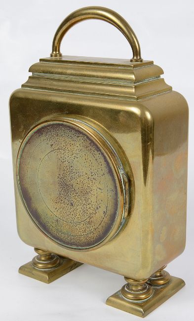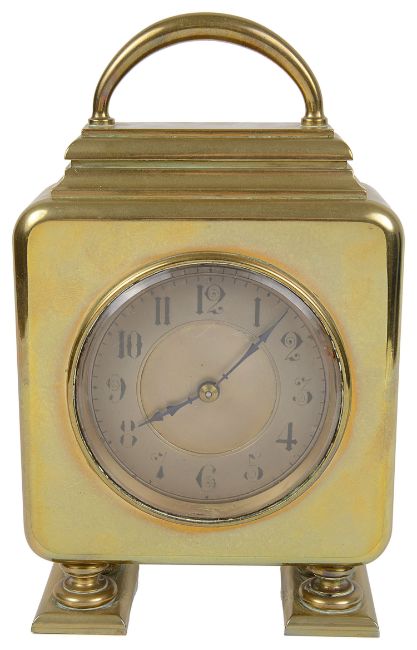 the circular silver dial with arabic numerals seconds track and blue steel hands, 8 day circular drum movement numbered 1394, the square case with rounded corners surmounted with a carrying handle raised on paired supports and rectangular plinth feet