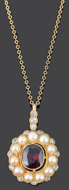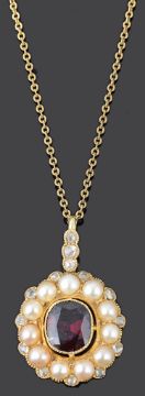 having central deep coloured garnet within a border of half cultured pearls and further diamond point detail, matching rose diamond set suspension loop, yellow metal mount tests for gold, suspended from a fine yellow metal chain