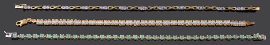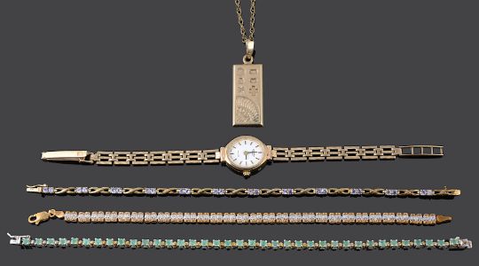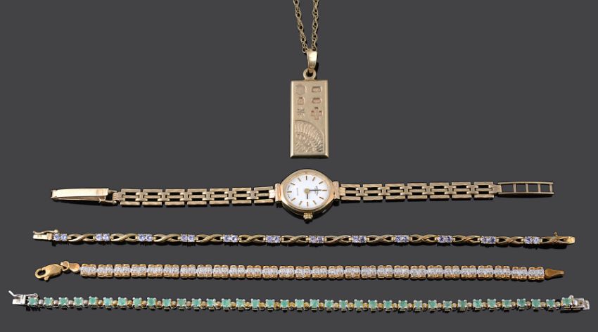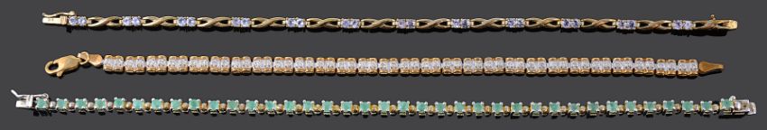 the diamond bracelet marked for 9ct gold together with another 9ct gem set bracelet, a silver mounted emerald set line bracelet, a 1/4 ounce, 9ct gold, diamond point set gold ingot on chain and a 9ct gold ladies Rotary wristwatch on gold bracelet, four associated contemporary boxes (qty)