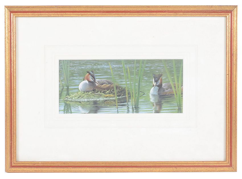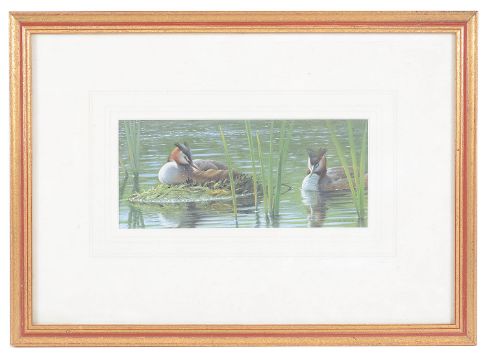 'Great Crested Grebe on the nest', gouache, signed bottom right, bears The Wildlife Art Gallery label to reverse, mounted, framed