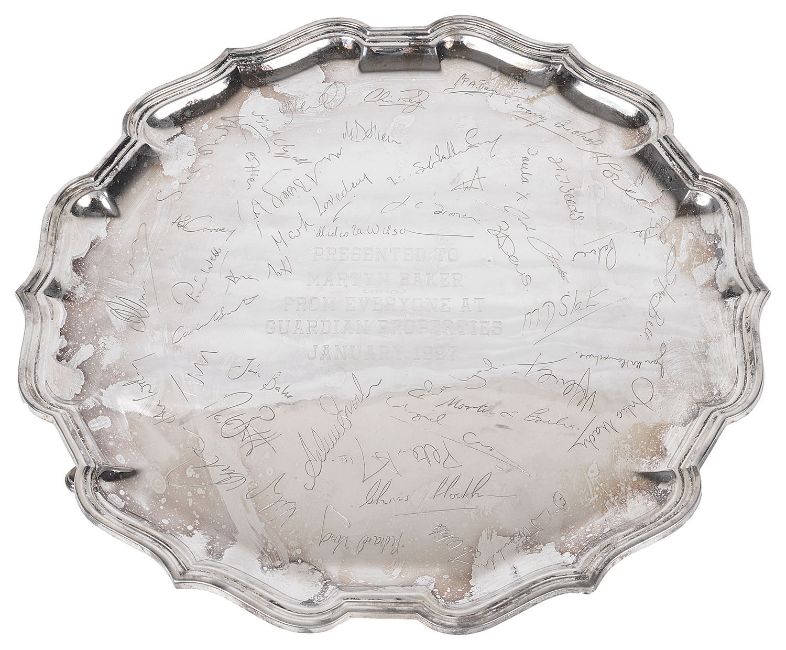of circular form with raised pier crust border, raised on forn stepped feet, engraved to centre ' presented to Martyn Baker from everyone at Guardian Properties January 1977' surrounded by facsimile signatures,