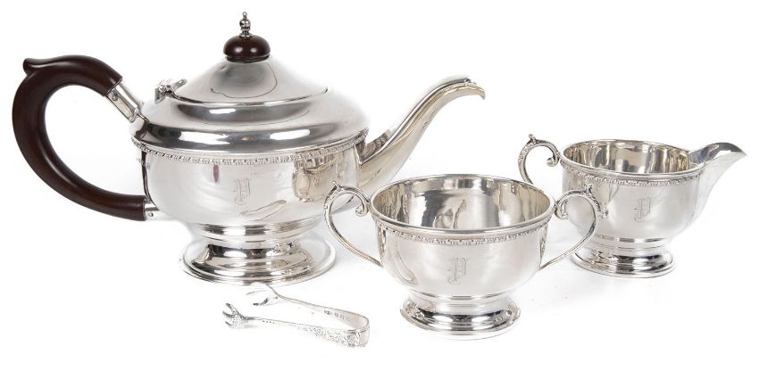of circular form, raised on a domed foot spreading foot, the teapot with bakelite finial and loop handle, initialled, together with an associated pair of claw-end sugar tongs (4)
