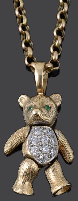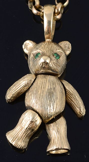the pendant having gem set eyes and tummy, head, arms and legs hinged, the bear suspended from a long 9ct gold neck chain