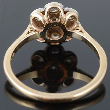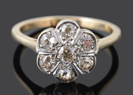 the central diamond within six diamonds in petal shaped mounts, mount tests for gold