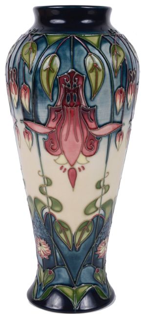 of inverted baluster form, tube line decorated with Columbine flowers against a cream ground body, impressed marks, dated 2002 in brown