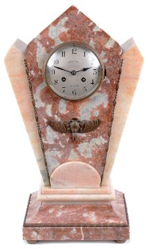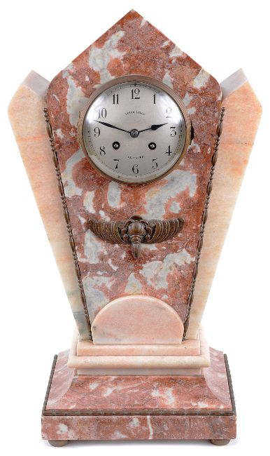 A French Art Deco rouge and pink marble fan shaped mantle clock