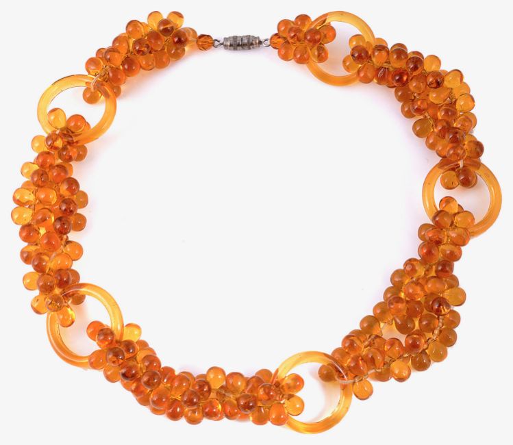 the coral brooch with rope twist detail , together with a pair of faux coral Art deco drop earrings, possibly Neiger Bros., part branch coral chain necklace, an Art Deco amber glass choker necklace, an Art Deco coloured glass drop brooch and a small collection of paste jewellery, associated bracelet box (qty)