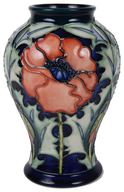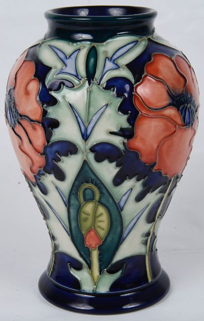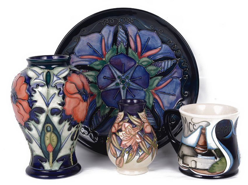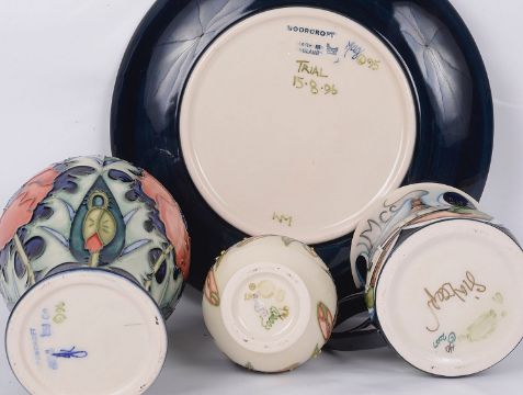 comprising a 'Poppy' vase designed by Emma Rafferty of baluster form, impressed marks dated 96, silver line, together with a 'Morning Glory' year plate trial designed by Rachel Bishop impressed marks, marked Trial and dated 15.8.96, a small baluster vase tube line decorated with orchids, dated 2003 and a Moorcroft Collectors Club 1987-2007 anniversary mug designed by Sian Leaper, (4)