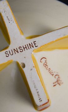 A rare Clarice Cliff Conical Yoo Hoo pattern candle holder, the flared green body raised on orange and black feet and with orange and black central sconce, remains of black and green printed marks to base, together with a Clarice Cliff Sunshine pattern Conical bowl, brown printed factory marks to base