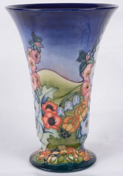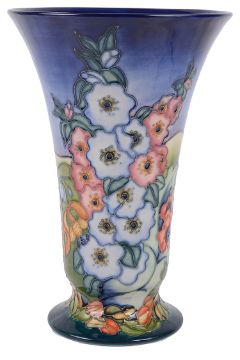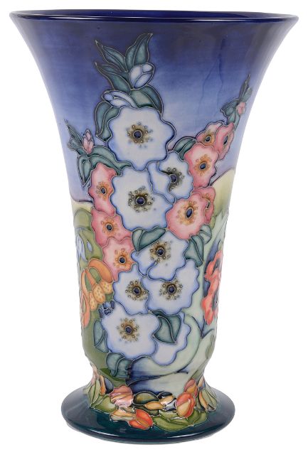 of flared trumpet from, tube line decorated with hollyhocks and other flowers against a fading blue ground, impressed marks and dated 94 marked in green Trial 23.2.95