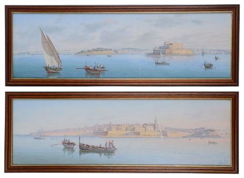 A pair of panoramas of Valetta, gouache, signed J Bonello, framed, (2)