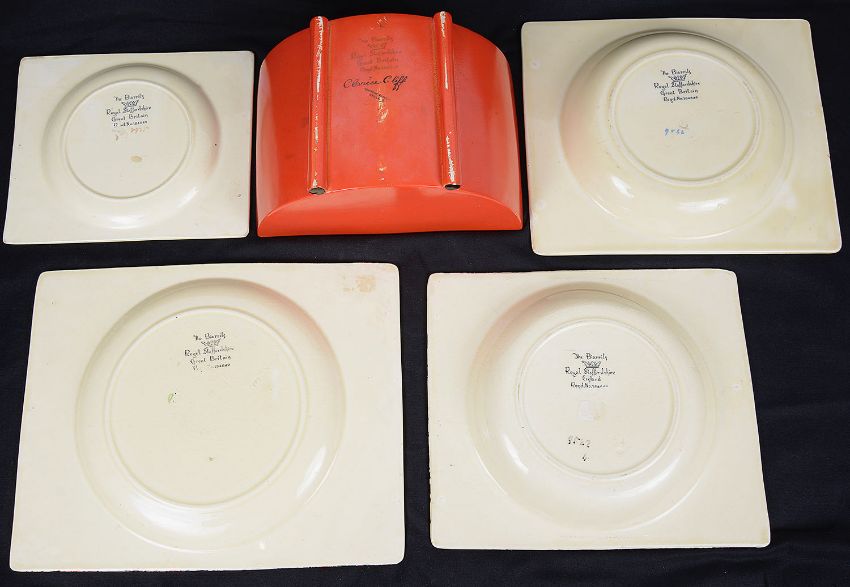 A Royal Staffordshire Clarice Cliff Biarritz Bonjour shape tureen and cover, covered in a red glaze with black glazed feet and handle, black printed marks to base, together with four assorted Royal Staffordshire Biarritz plates (5)