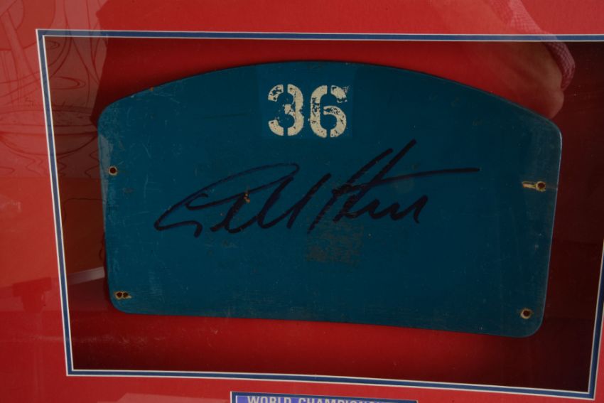 the painted blue original seat back numbered '36' and signed by goal scorer Sir Geoff Hurst, in a presentation frame with two signed photographic prints and a replica ticket, mounted and frame with