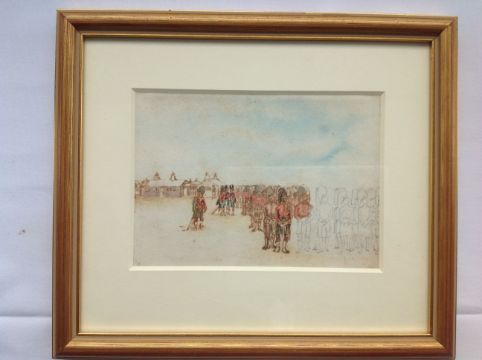 'Highland regiment on parade ground', a watercolour sketch, unsigned, mounted glazed