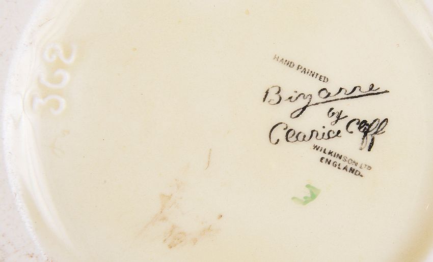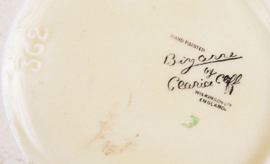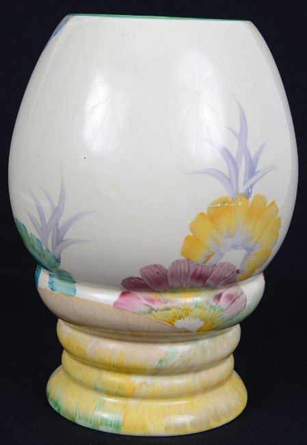 A Clarice Cliff Bizarre Rhodanthe pattern Viscaria colourway vase, the ovoid top above a lobed base, shape number '362', black printed factory mark to base