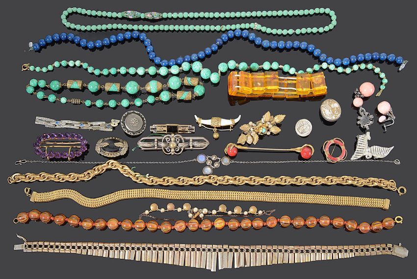 including various Victorian jet necklaces, Art deco carved ivory and other clips and brooches, Art Deco beads and necklaces including a jade glass necklace probably by Neiger Brothers and a collection of other Art Deco and later brooches, beads and bracelets (qty)