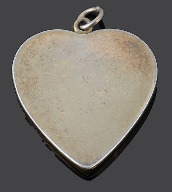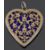 the white metal backed mount testing for silver, the blue glass heart with scrolling foliate gold overlay decoration