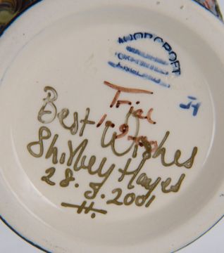 of baluster from, tube line decorated, impressed marks, marked Trial in brown, signed 'Best wishes Shirley Hayes 28.5.2001' in gold