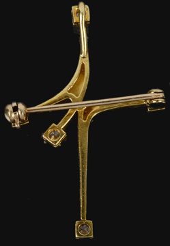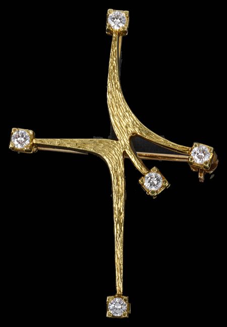 A Continental diamond set modernist pendant broochthe five pointed abstract design having single claw set diamond to each point and textured finish, mount marked 0.750 for 18ct gold, pendant suspension loop to reverseapprox. 5.64 gm, approx. 4.1 x 2.8 cm.Condition:  Overall good, unsigned, some unevenness to reverse polished surface, possible historic, competent repair or alteration, diamonds bright, white, matched and lively