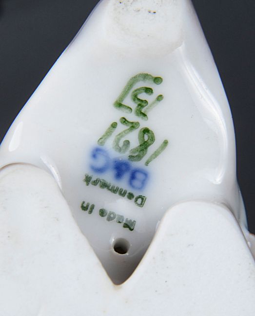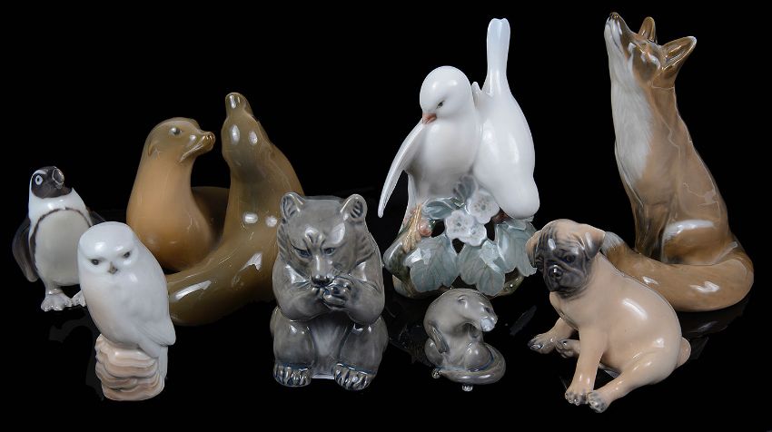 1475 - Barking fox, 3014 - Bear designed by Knud Khyn, 402 - Pair of lovebirds, 2519 - Pair of seals, 3169 - Seated pug designed by Theodor Madsen, 1821 - Standing penguin, 1741 - Snowy owl, and 2333 - Otter, factory marks (8)