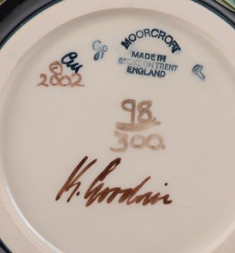 of squat from, tube line decorated, impressed marks and dated 2002 and signed K Goodwin in brown