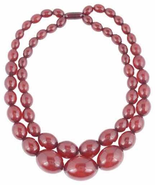 the beads of even colour and matched, graduating to either end and with screw action amber bead fastening, largest bead approximately 3.2 cm. across